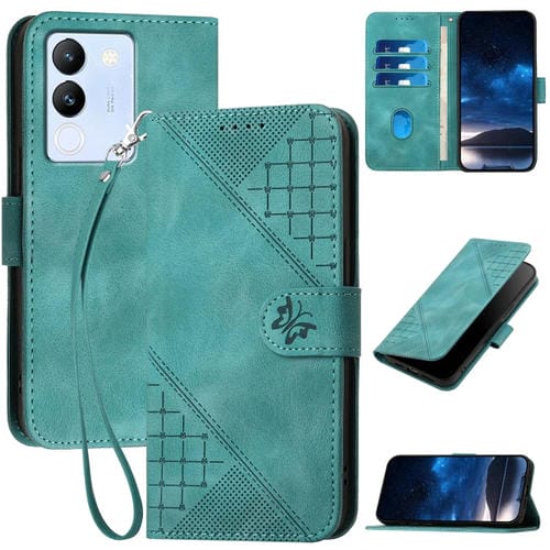Funda de Cuero con Tapa y Cordón para Vivo Y200 5G Global Yx0080 con Diseño En Relieve de Mariposa y Cuadrícula (Azul Claro)