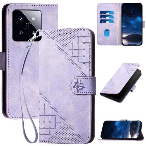 Funda De Cuero Con Tapa Y Cordón Para Xiaomi 14 Pro Yx0080 Con Diseño De Mariposa En Relieve Y Cuadrícula (Morado Claro)