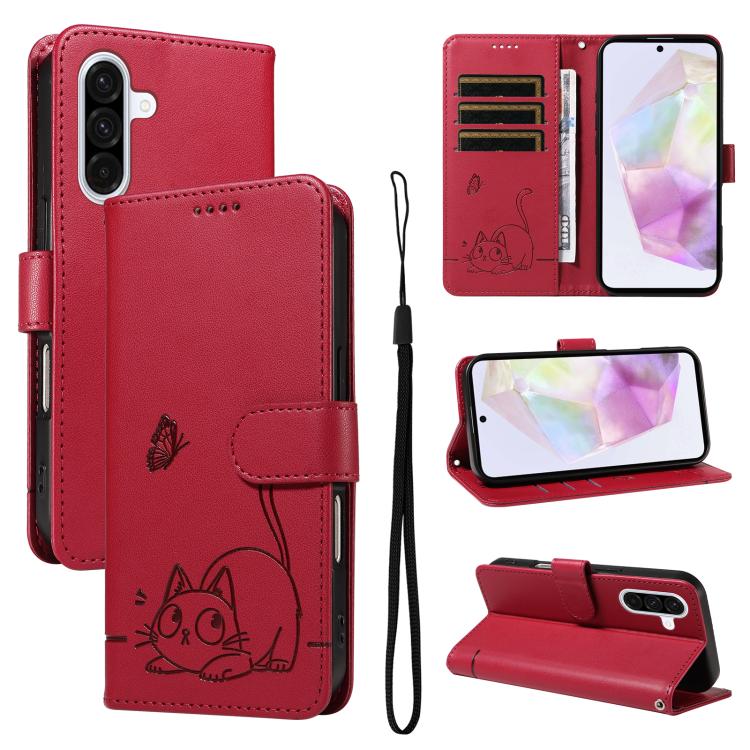 Funda de cuero con tapa y estampado de gato adorable para Samsung Galaxy A56 5G (roja)
