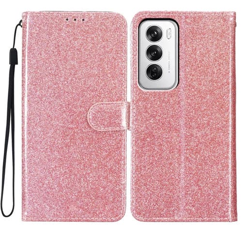 Funda de Cuero con Tapa y Purpurina para Oppo Reno12 Global (Oro Rosa)