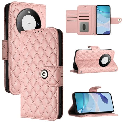 Funda de Cuero con Tapa y Textura Rombal para Huawei Mate 60 con Cordón (Rosa Coral)