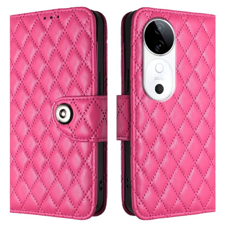 Funda de Cuero con Tapa y Textura Rombal para Teléfono Vivo S19 con Cordón (Rosa Rojo)