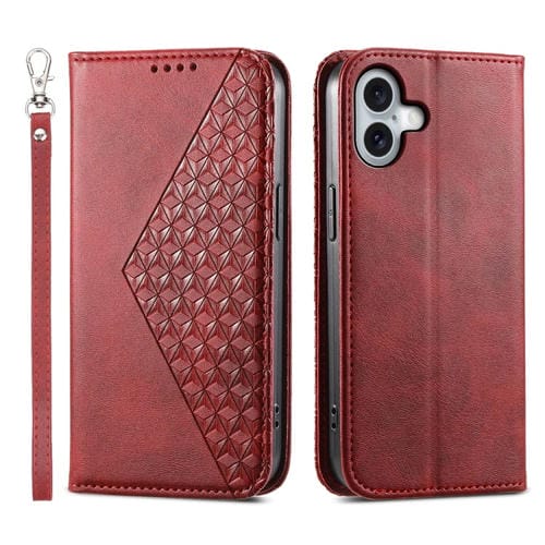 Funda de Cuero Magnética para iPhone 16 Plus Textura Piel de Becerro Cuadrícula Cúbica (Rojo)