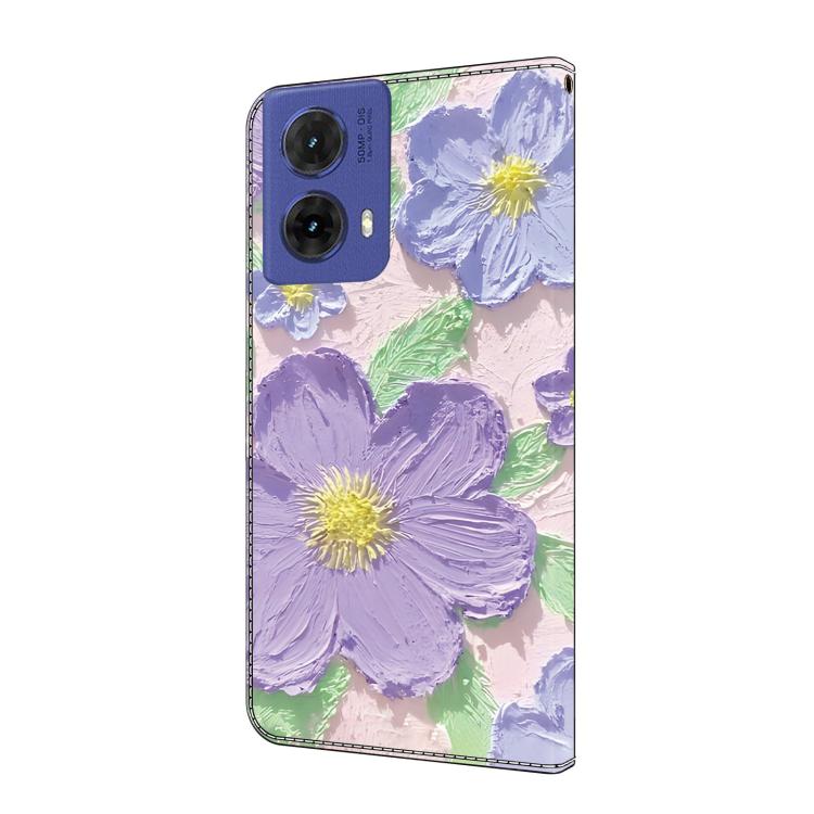 Funda de Cuero Pintada a Mano para Motorola Moto G85 con Flores Moradas (Óleo)