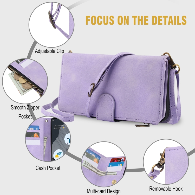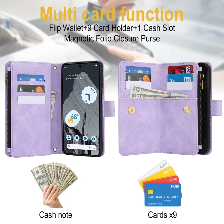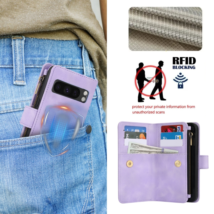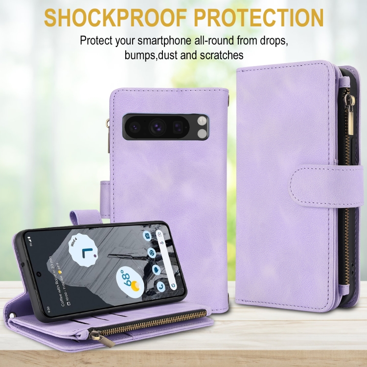Funda de Cuero Rfid con Cremallera y Cordón para Google Pixel 8 Pro Dream con 9 Tarjetas (Morado)