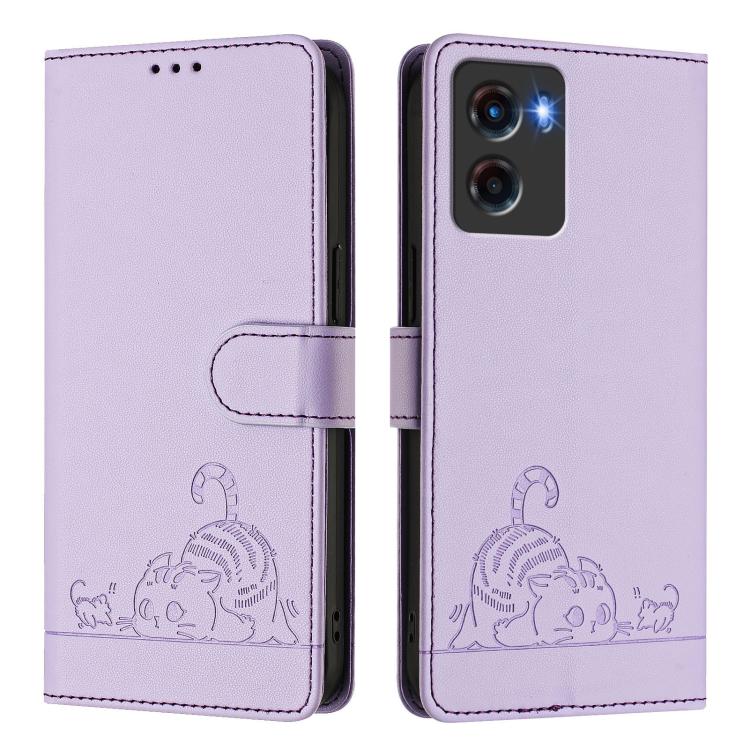 Funda de Cuero Rfid para Motorola Moto G05 con Estampado de Rata y Gato en Relieve y Cordón (Morado)