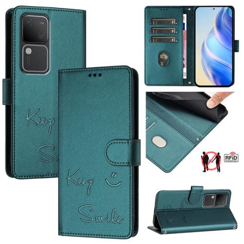 Funda de Cuero Rfid con Relieve de Sonrisa Global para Vivo V30 Pro 5G (Verde Pavo Real)