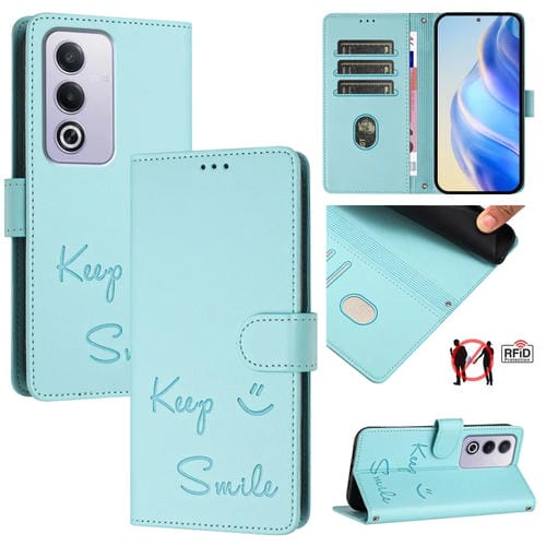 Funda de Cuero Rfid con Relieve Sonriente para Oppo A3 Pro 5G Global/India (Verde Menta)