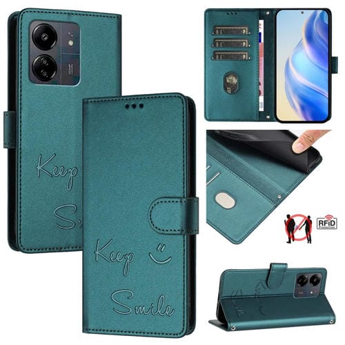 Funda de Cuero Rfid con Relieve Sonriente para Redmi 13C 4G (Verde Pavo Real)