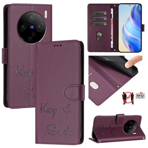 Funda de Cuero Rfid con Relieve Sonriente para Vivo X100 (Violeta)