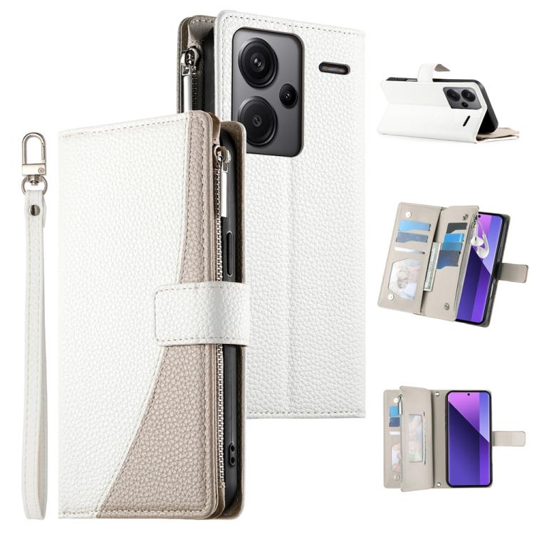 Funda de cuero tipo billetera con cremallera para Redmi Note 13 Pro+, con costuras globales y correa corta (blanca)