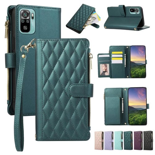 Funda de Cuero Tipo Billetera con Cremallera Rombal para Redmi Note 10/10S (Verde)
