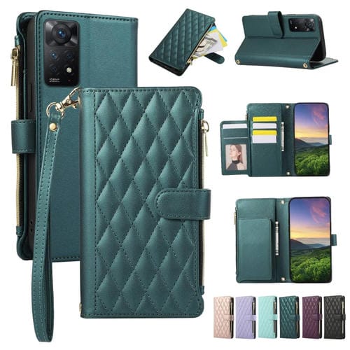Funda de Cuero Tipo Billetera con Cremallera Rombal para Redmi Note 11 Pro 4G (Verde)