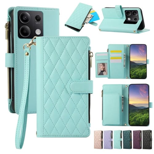 Funda de Cuero Tipo Billetera con Cremallera Rombal para Redmi Note 13 5G (Cian)