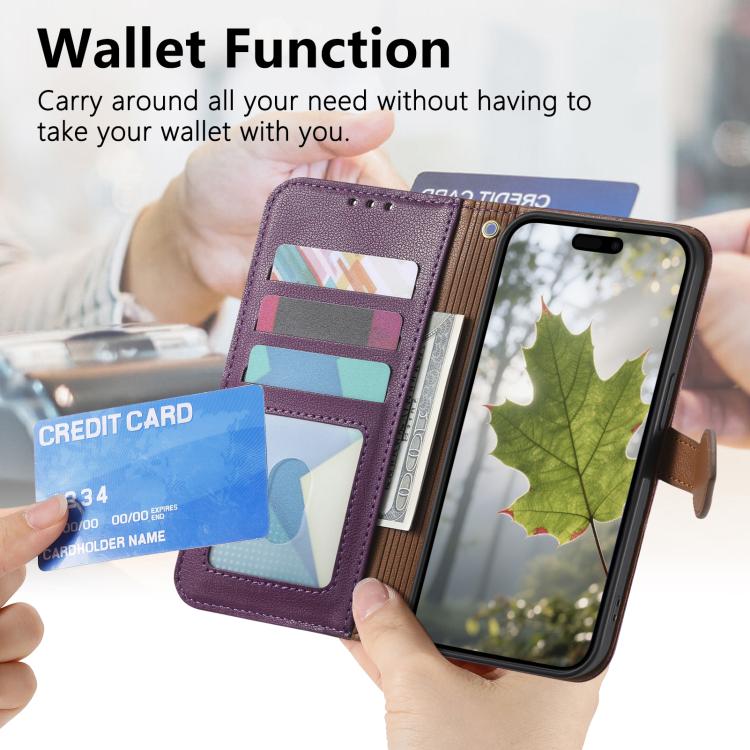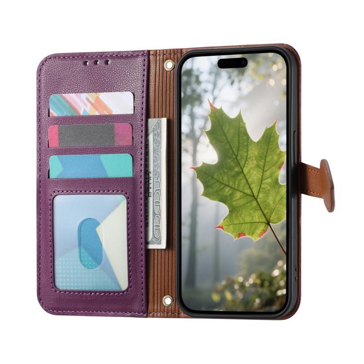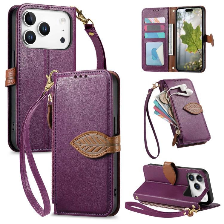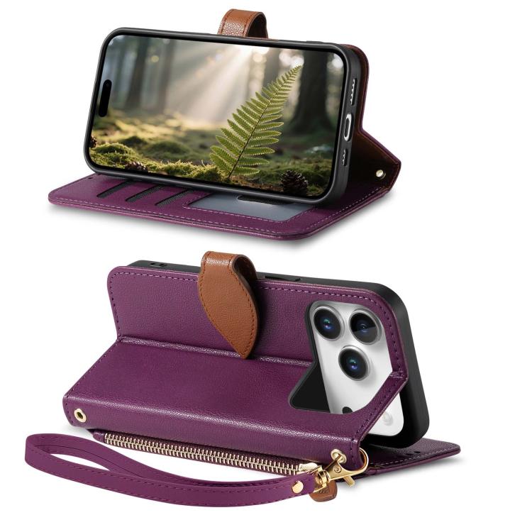 Funda de cuero tipo billetera con hebilla de hoja y cremallera para iPhone 17 Pro Max (morado)