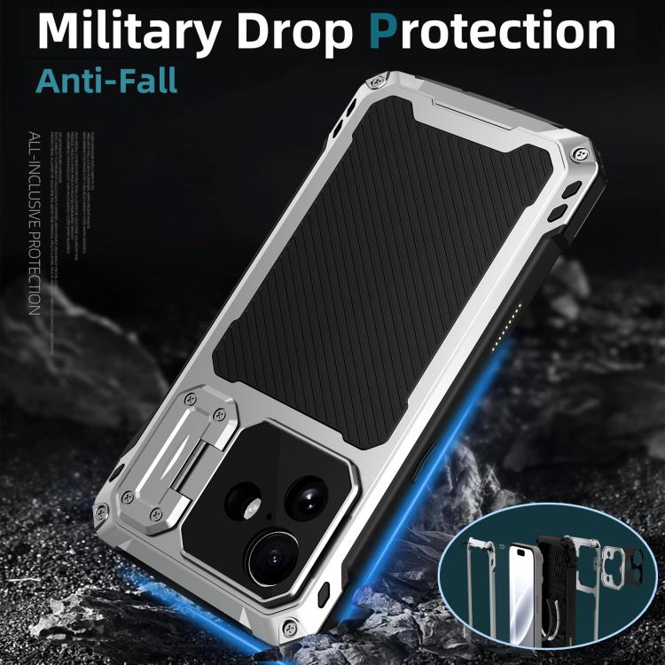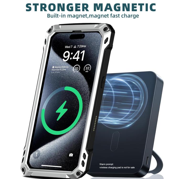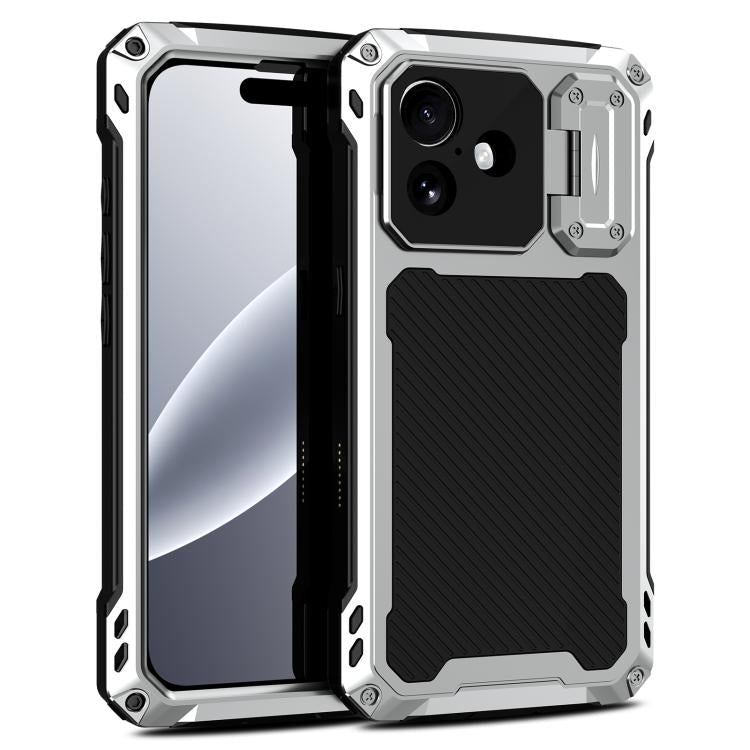 Funda de metal con soporte para lente de iPhone 17, resistente al agua IP54, triple protección MagSafe (plateada)