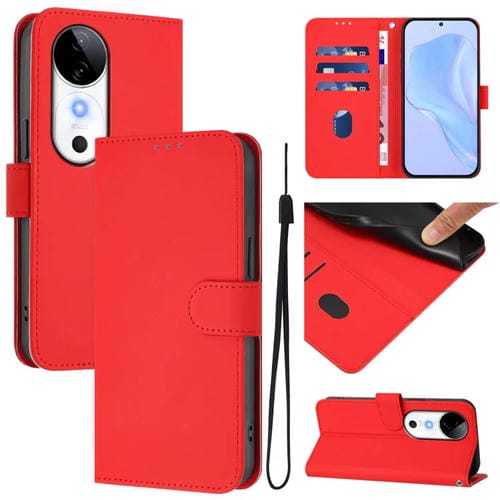 Funda de Piel con Cordón para Teléfono con Diseño de Piel Sintética de Color Liso para Vivo S19 (Rojo)