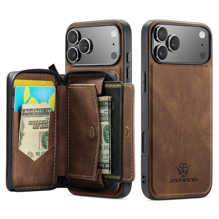 Funda de piel con cremallera magnética horizontal tipo libro JEEHOOD J02 para iPhone 17 Pro (marrón)
