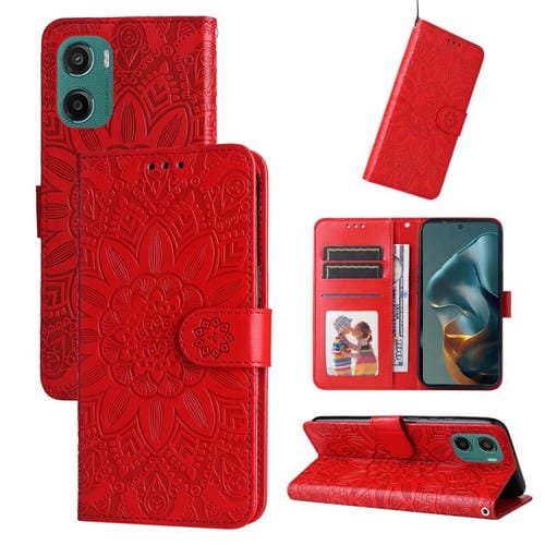 Funda de Piel Motorola Moto G05/E15 con Diseño de Girasol en Relieve (Rojo)
