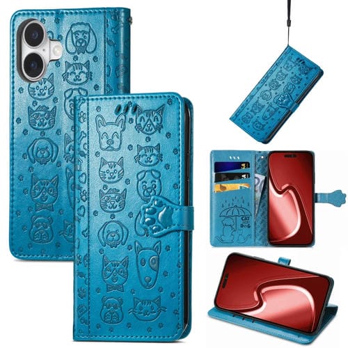 Funda de Piel con Relieve de Gato y Perro para iPhone 16 Plus (Azul)