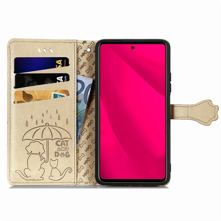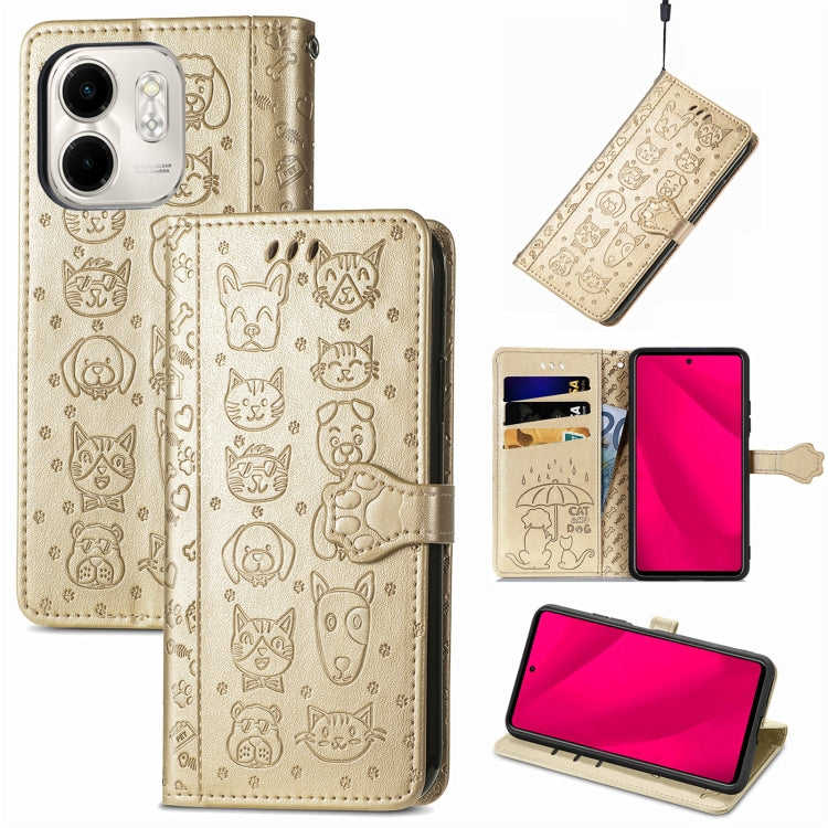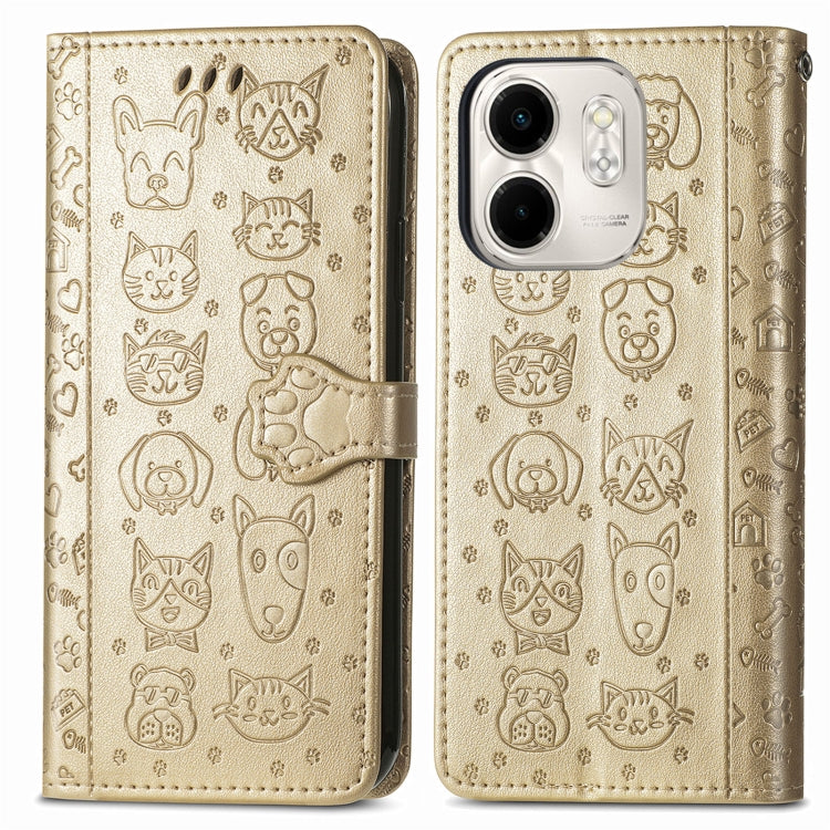 Funda de Piel con Relieve Gato y Perro para Teléfono Infinix Smart 9 (Dorada)