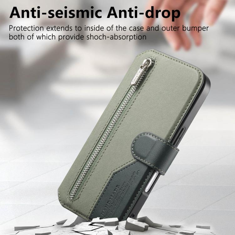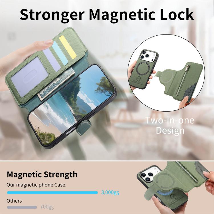 Funda de piel para iPhone 17 Pro, de tela de sarga, con MagSafe, RFID, antirrobo y cremallera (verde).