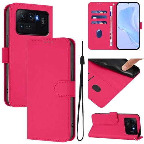 Funda de Piel Sintética con Cordón para Xiaomi Mi 11 Ultra Skin Feel de Color Liso (Rosa Rojo)