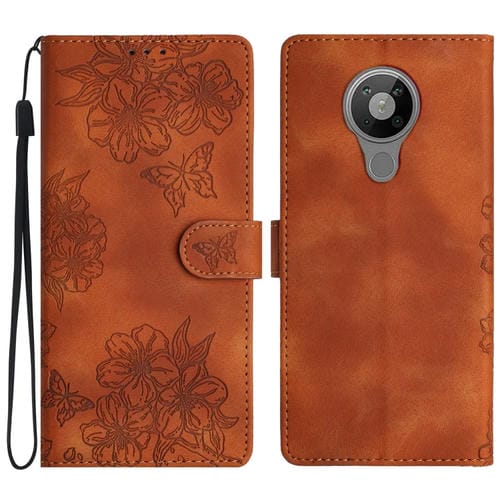 Funda de PU con Relieve de Mariposa y Flor de Cerezo para Nokia 5.4 (Marrón)