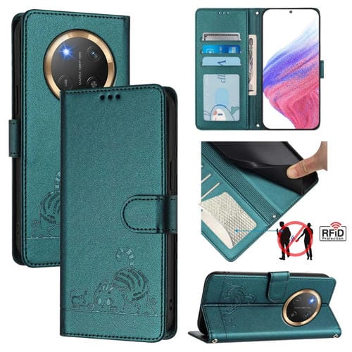 Funda de Teléfono Honor X9C 5G Global Rfid Cuero con Cordón y Patrón Gato y Rata (Verde Pavo Real)