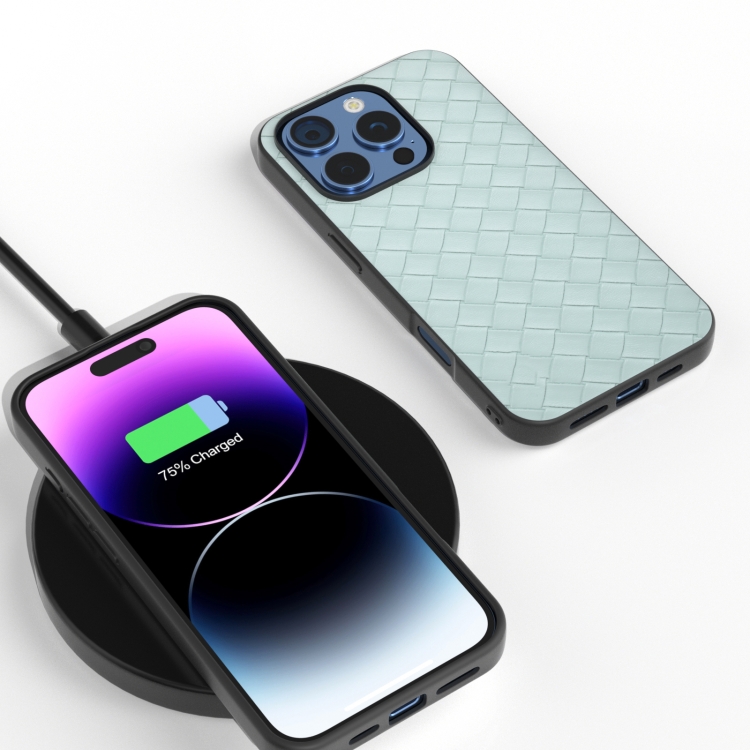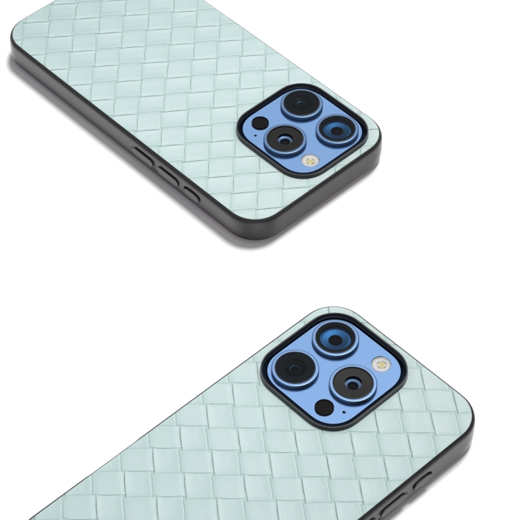 Funda de Teléfono con Textura Tejida de Pu con Marco Negro para iPhone 16 Pro Max (Verde Claro)