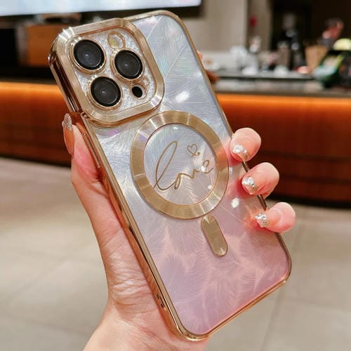 Funda TPU Purpurina Degradado Plumas de Amor para iPhone 13 Pro (Dorada)