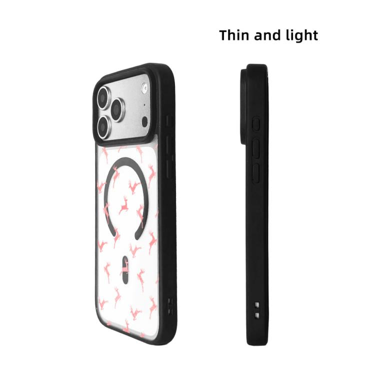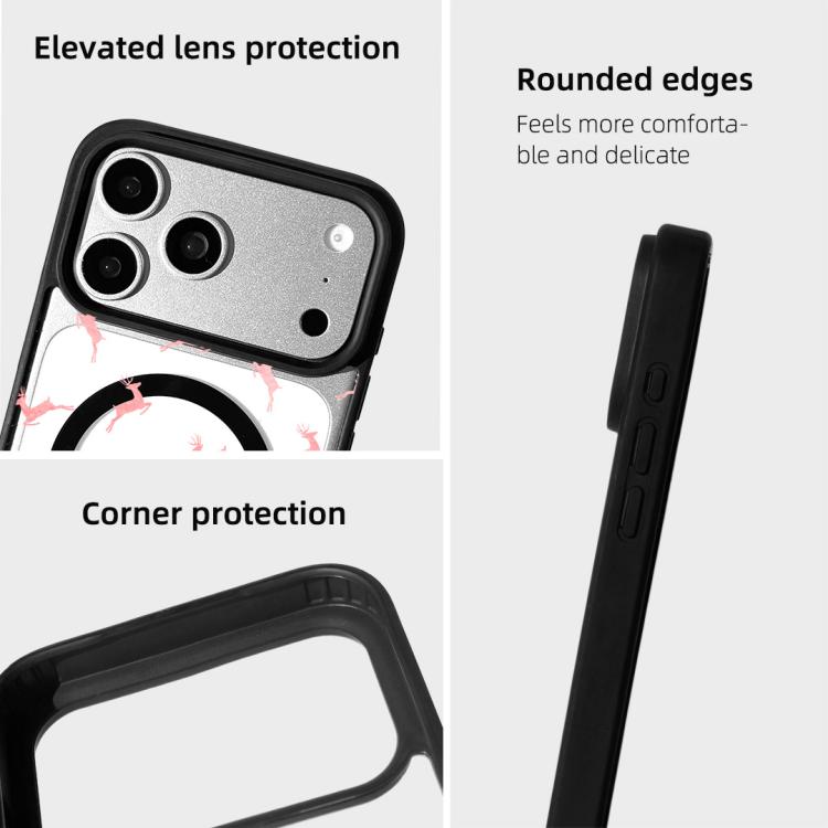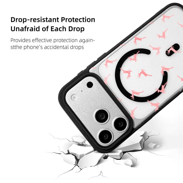 Funda magnética resistente con borde negro pintado para iPhone 17 Pro de la serie navideña (Reno rosa saltando)