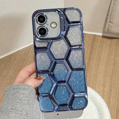 Funda para iPhone 16 Grabado Láser Galvanoplastia Purpurina Panal 3D (Azul)