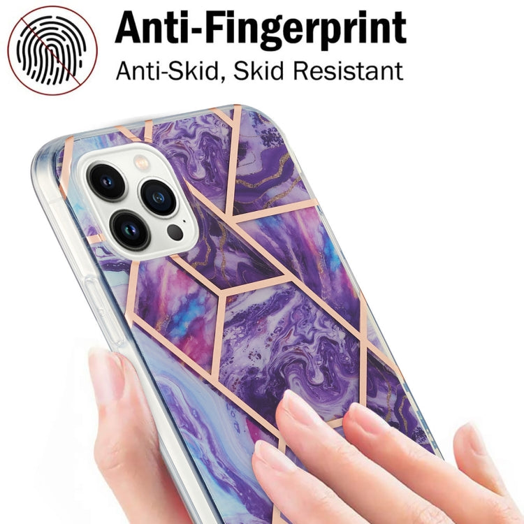Funda para iPhone 16 Pro Diseño Flores Mármol Empalme Galvanizado Doble Cara Imd TPU a Prueba de Golpes (Morado Oscuro)