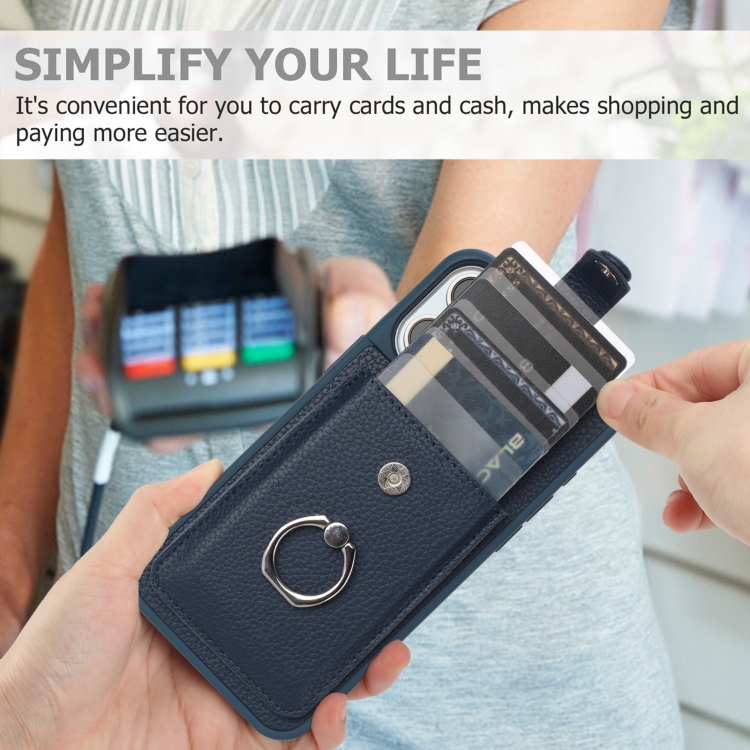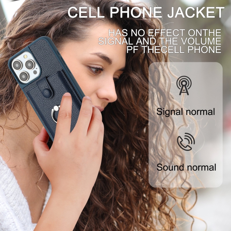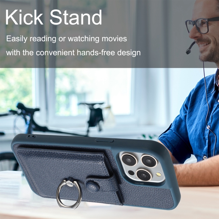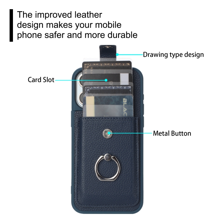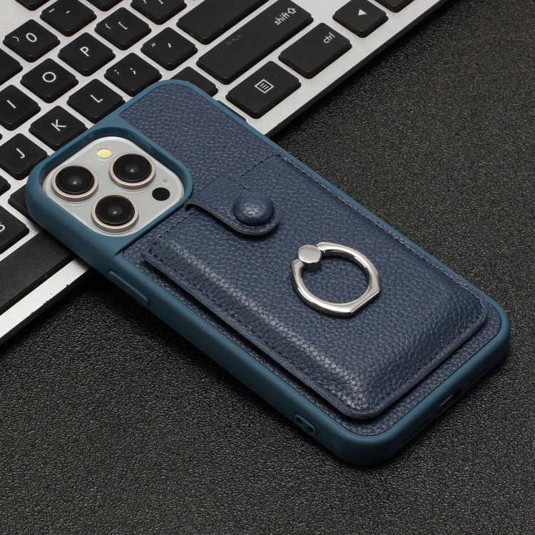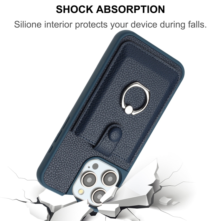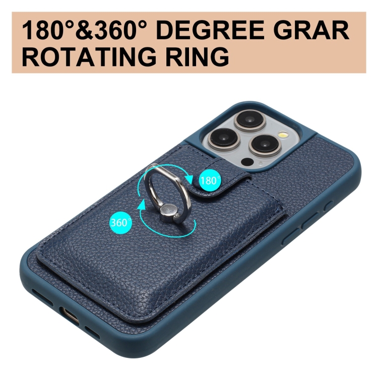 Funda para iPhone 16 Pro Max Textura de Lichi con Tarjeta y Soporte para Anillo (Azul)