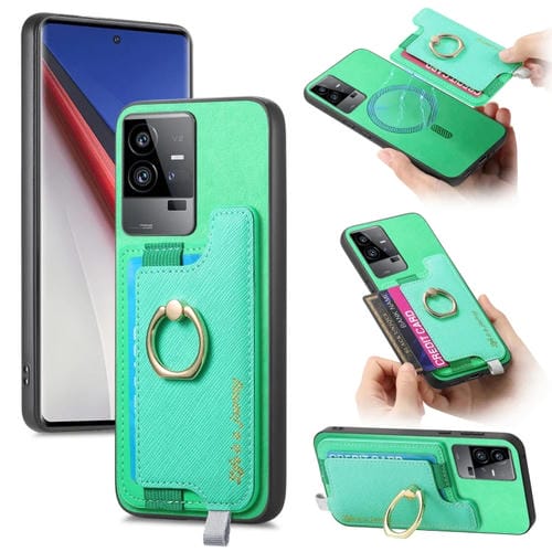 Funda para Teléfono con TaRJetero y Anillo de Cuero con Diseño Retro Magsafe Cross para Vivo Iqoo 11 Pro 5G (Verde)