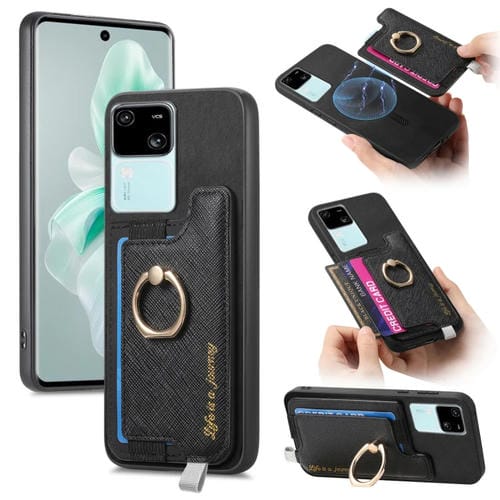 Funda para Teléfono con TaRJetero y Anillo de Cuero con Diseño Retro Magsafe Cross para Vivo S18/S18 Pro 5G (Negro)