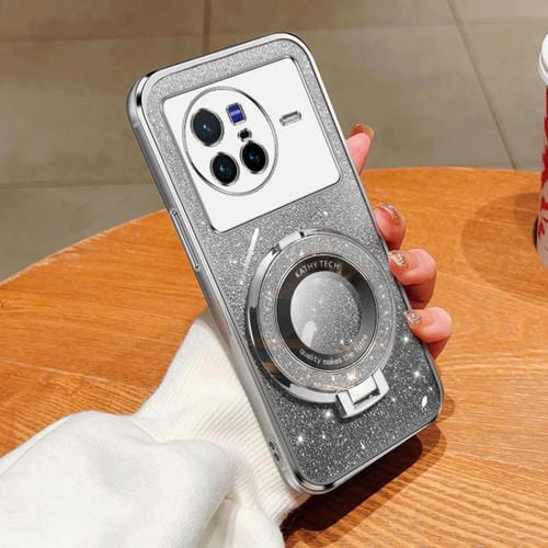 Funda para Teléfono de TPU con Soporte Redondo con Purpurina y Degradado Plateado para Vivo X80 (Plateada)