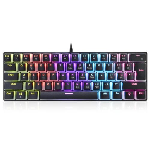 • 61 teclas mecánicas con interruptores verdes, interfaz USB 2.0, tasa de informe de 1000 Hz, Cable de 1,5 metros, bloqueo de tecla WIN, Soporte para 12 efectos de iluminación RGB, vida útil del interruptor mayor a 20 millones de pulsaciones