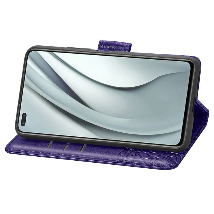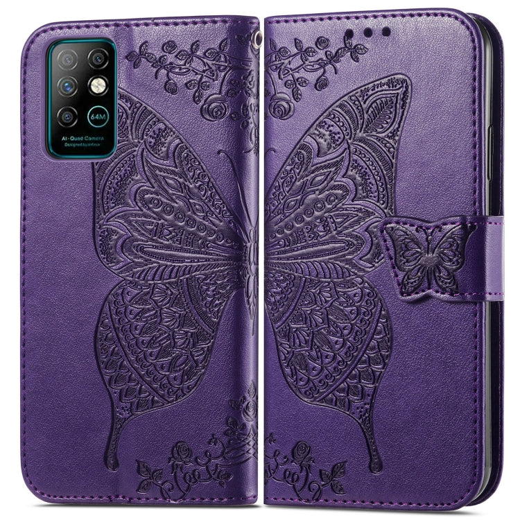 Funda Cuero Horizontal Mariposa Amor Flores en Relieve con Soporte, Ranuras y Cordón para Infinix Nota 8 (Morado Oscuro)