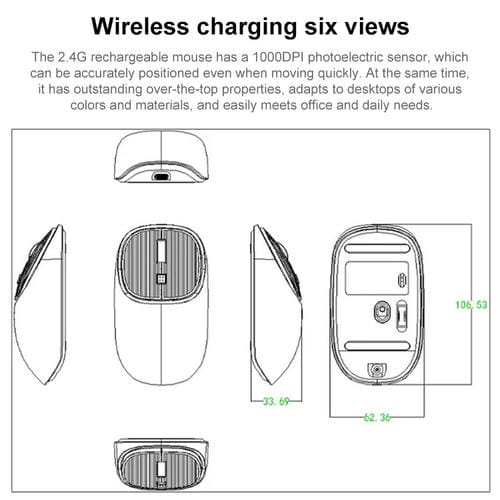 • Dimensiones: 106,5x62,5x33,5 mm; resolución ajustable 1000-1200-1600 DPI; Batería reCargable de 500mA; interruptor silencioso con vida útil de 5 millones de clics