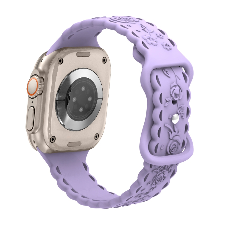 Correa de Silicona para Apple Watch Ultra 49mm con Relieve de Rosa 3D y Encaje (Púrpura Claro)