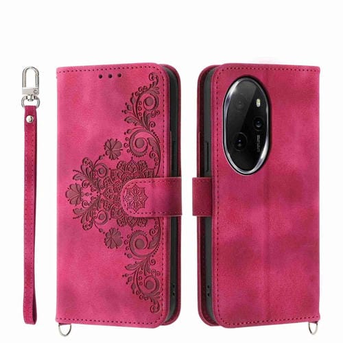 Funda de Cuero para Honor 100 Pro con Billetera, Relieve y Flores (Rojo Vino)