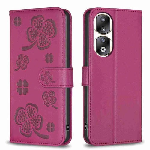 Funda de Cuero para Honor 90 Pro con Relieve de Cuatro Hojas (Rojo Rosa)