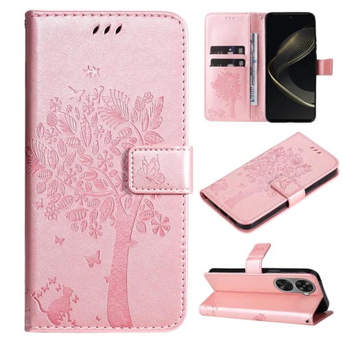 Funda para Huawei Nova 12 Se y Nova 11 Se de Cuero con Tapa y Patrón Árbol y Gato (Oro Rosa)