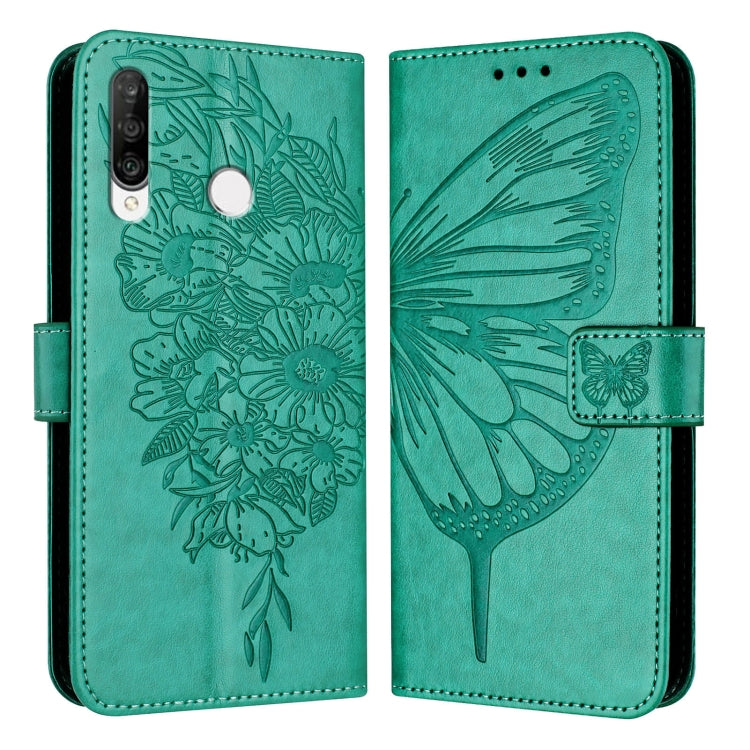 Funda de Cuero para Huawei P30 Lite Nova 4E con Mariposa en Relieve (Verde)