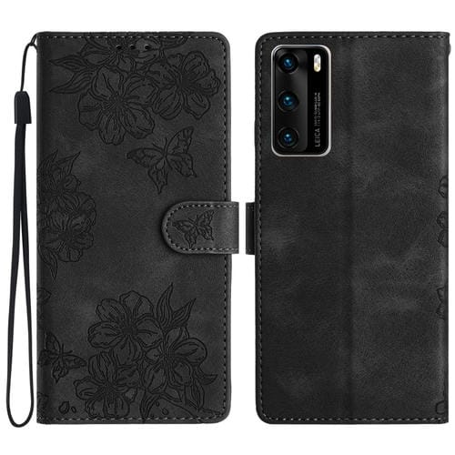 Funda para Huawei P40 Cherry Blossom Butterfly Skin Feel de PU en Relieve (Negro)