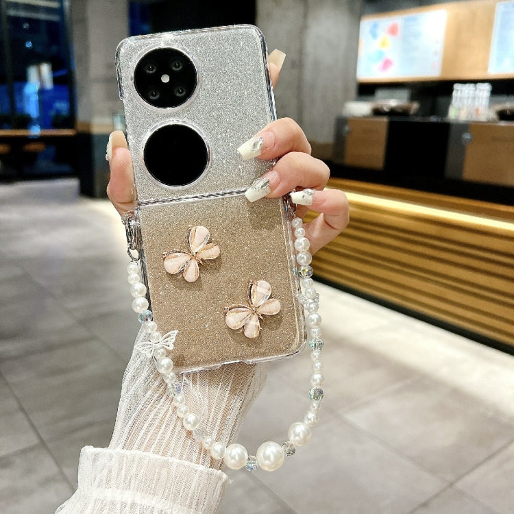 Funda para Huawei P50 Glitter Powder 3D Butterfly PC con Hebilla Lateral y Pulsera de Perlas (Oro)