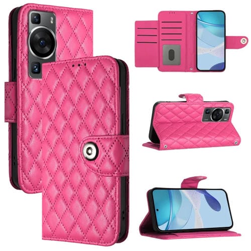 - 1x Funda de Cuero para Huawei P60 y P60 Pro con Tapa Textura Rómbica y Cordón (Rojo Rosa)