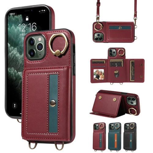 Funda para Teléfono iPhone 11 Pro Cuero con Soporte para Anillo y Bolso Cruzado para Tarjeta (Rojo)